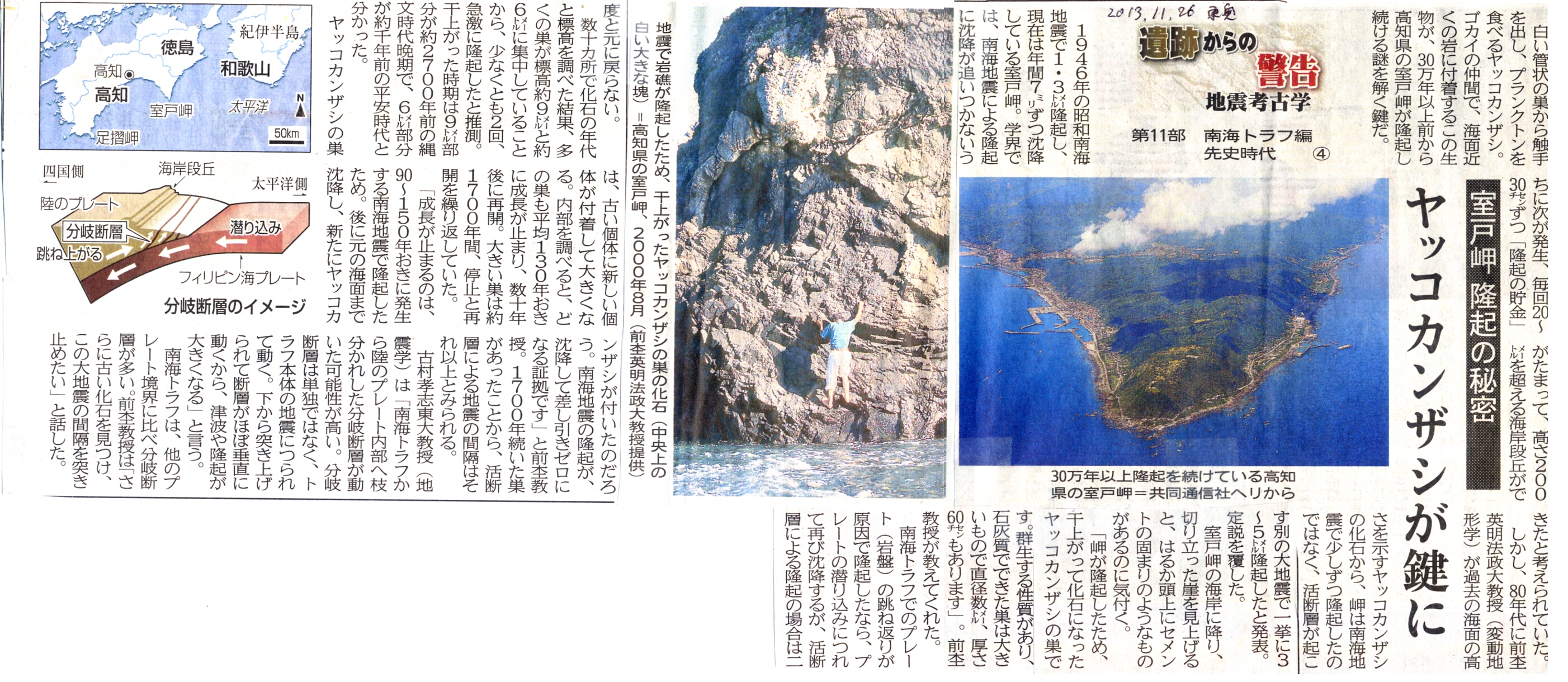 [2013_11_26_01]遺跡からの警告 地震考古学 室戸岬隆起の秘密 ヤッコカンザシが鍵に(東奥日報2013年11月26日)