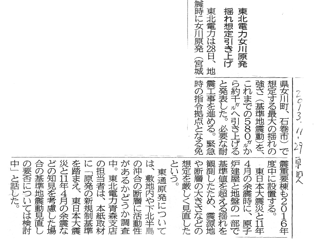 [2013_11_29_01]東北電力女川原発 揺れ想定引き上げ(東奥日報2013年11月29日)