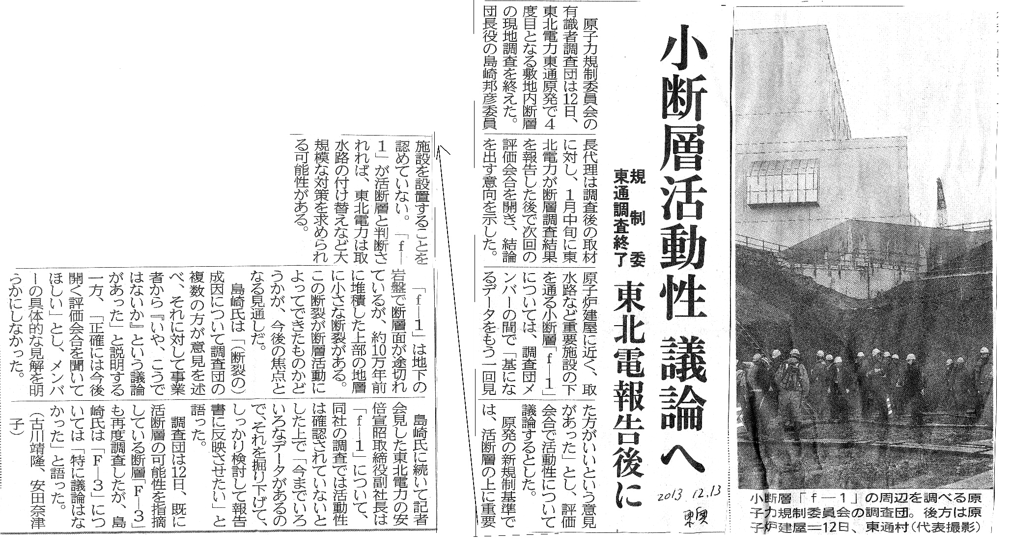 | [2013_12_13_01]小断層活動性 議論へ 規制委東通調査終了 東北電報告後に(東奥日報2013年12月13日) |