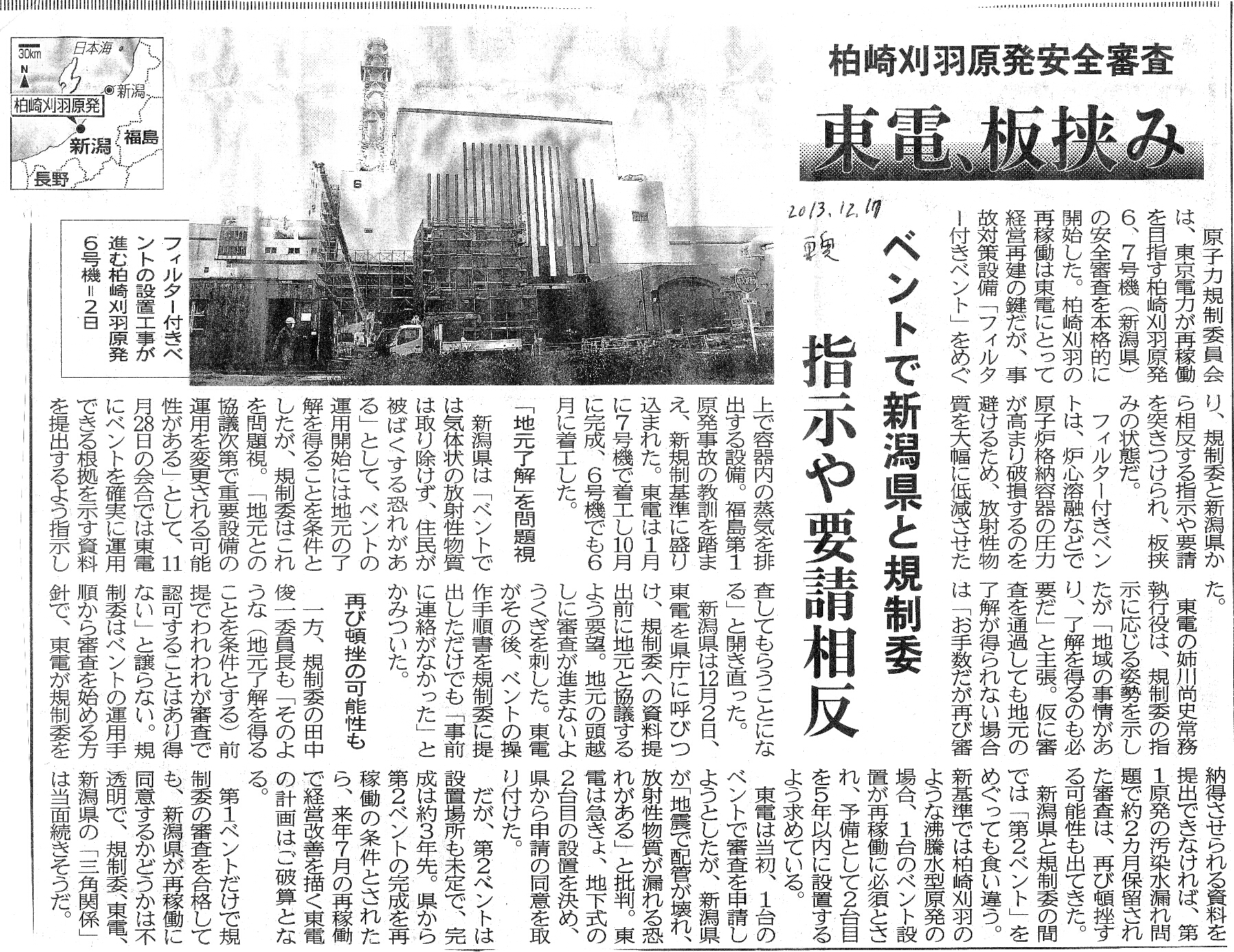 [2013_12_17_01]柏崎刈羽原発安全審査 ベントで新潟県と規制委 指示や要請相反(東奥日報2013年12月17日)
