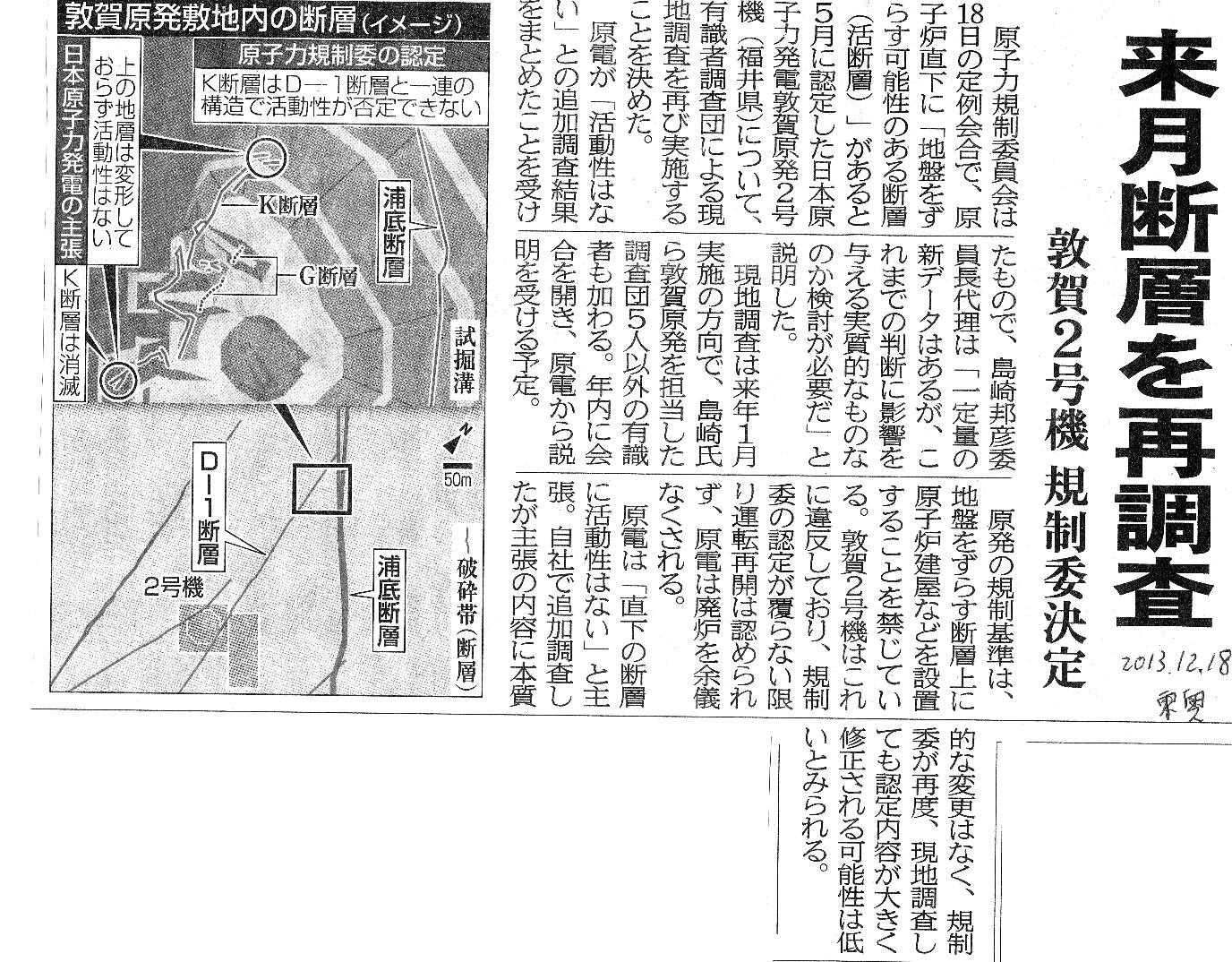 [2013_12_18_02]来月断層を再調査 敦賀2号機 規制委決定(東奥日報2013年12月18日)