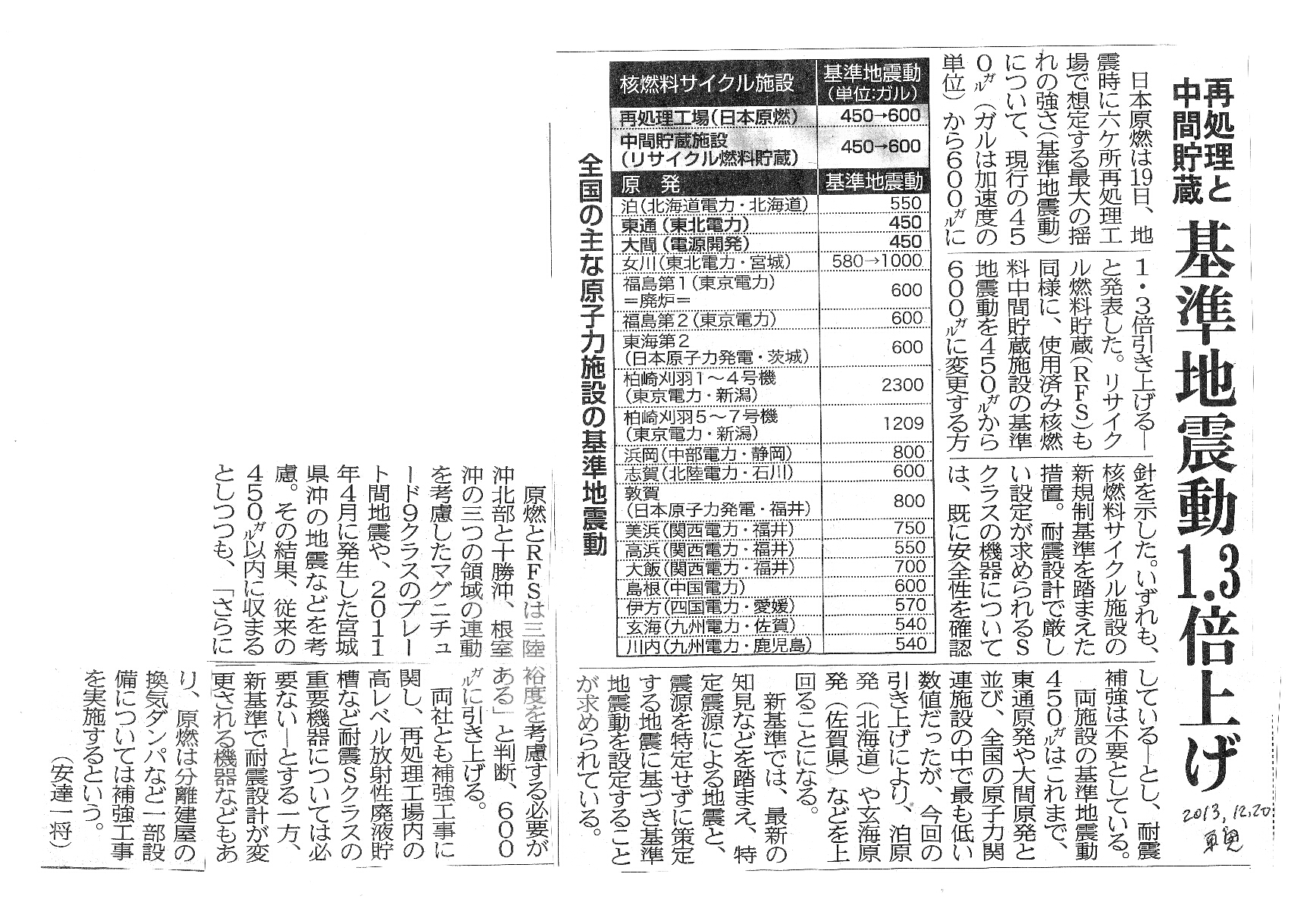 | [2013_12_20_02]再処理と中間貯蔵 基準地震動1.3倍上げ(東奥日報2013年12月20日) |