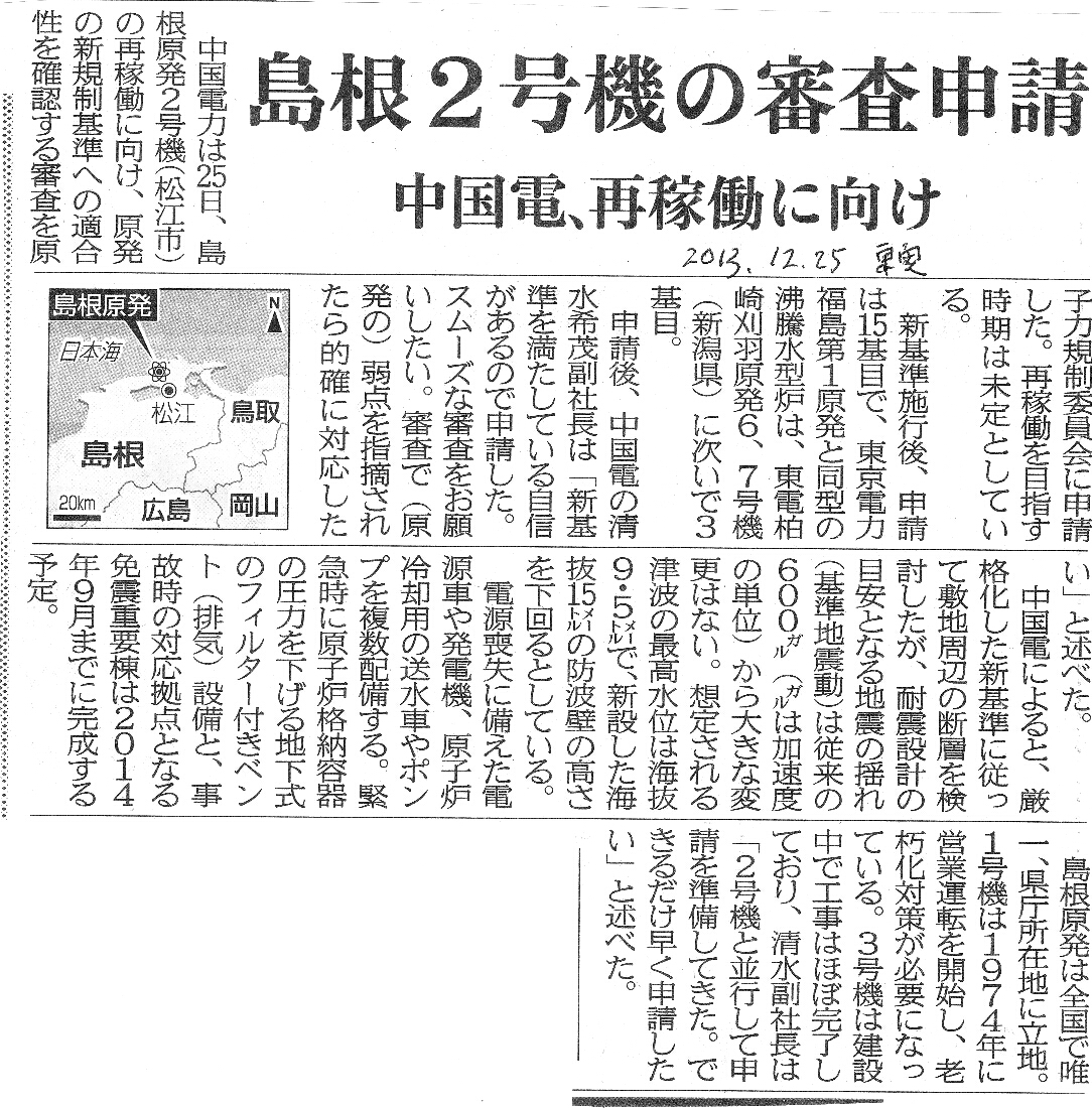 [2013_12_25_01]島根2号機の審査申請 中国電、再稼働に向け(東奥日報2013年12月25日)