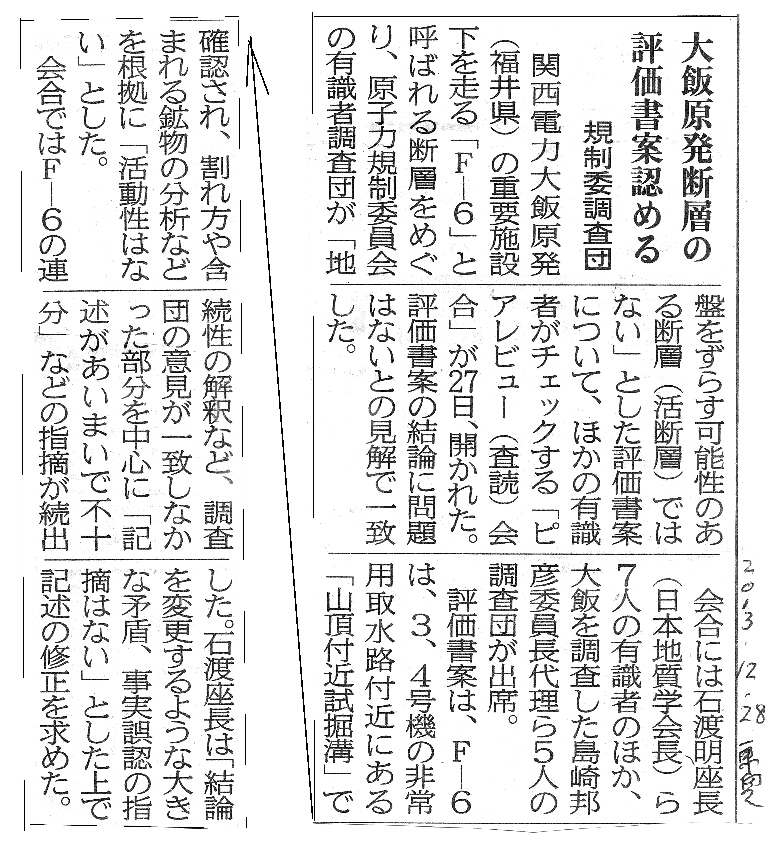[2013_12_28_01]大飯原発断層の評価書案認める 規制委調査団(東奥日報2013年12月28日)