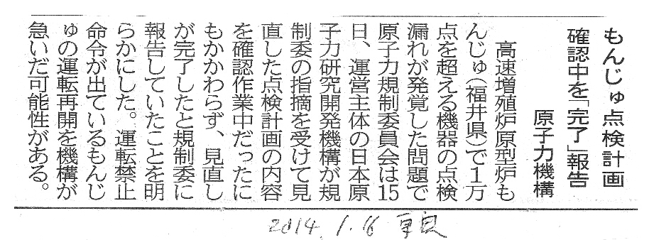 [2014_01_16_03]もんじゅ点検計画 確認中を「完了」報告 原子力機構(東奥日報2014年1月16日)