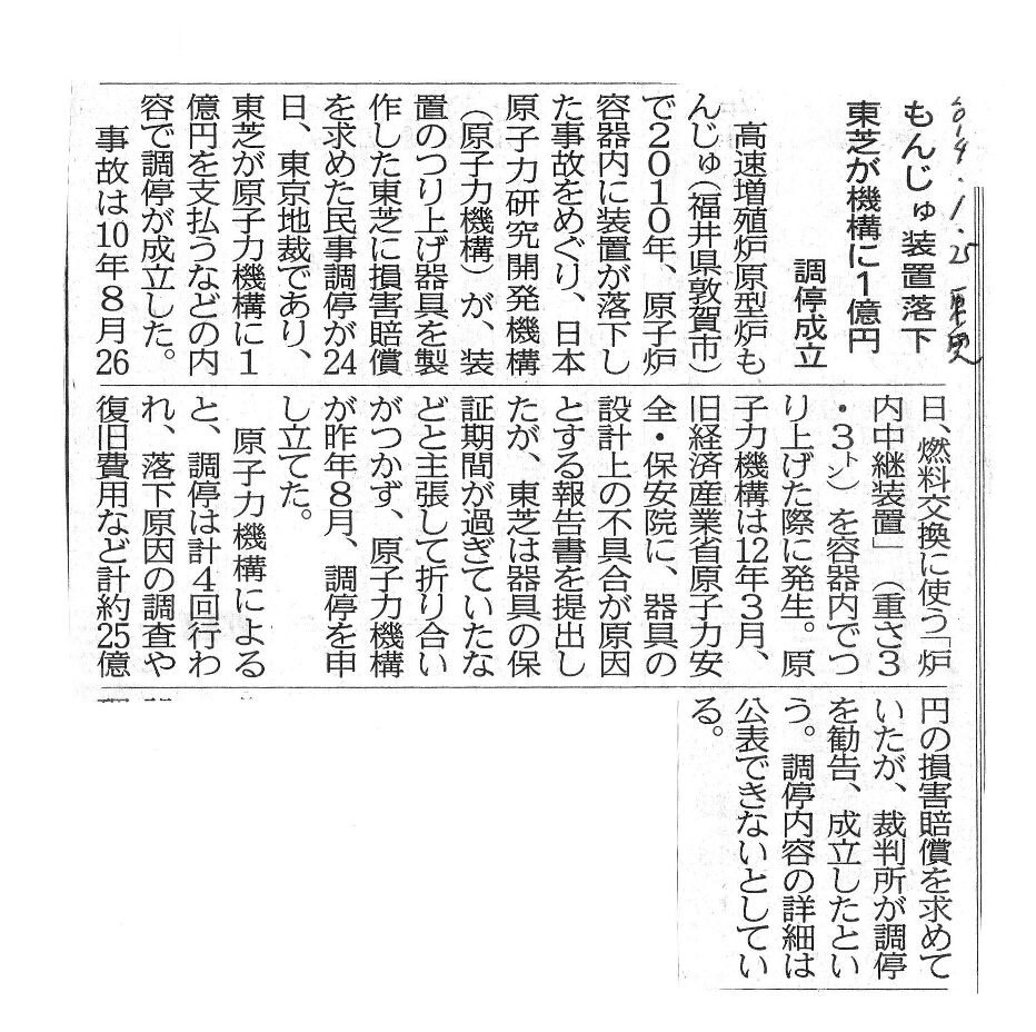 [2014_01_25_02]もんじゅ装置落下 東芝が損害に1億円 調停成立(東奥日報2014年1月25日)