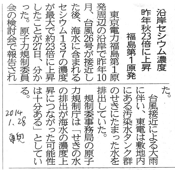 | [2014_01_28_01]沿岸セシウム濃度 昨年秋23倍に上昇 福島第1原発(東奥日報2014年1月28日) |
