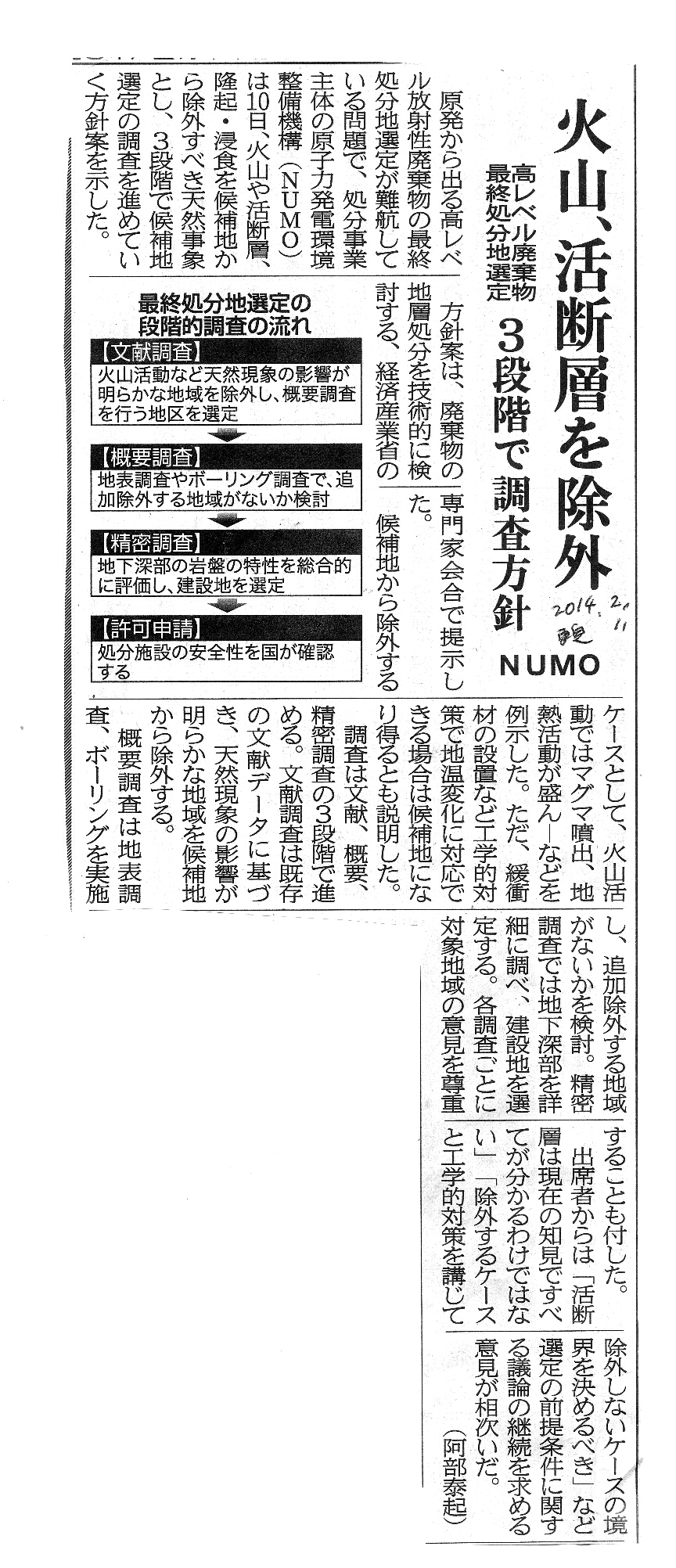 | [2014_02_11_01]火山、活断層を除外 高レベル廃棄物最終処分地選定 3段階で調査方針 NUMO(東奥日報2014年2月11日) |