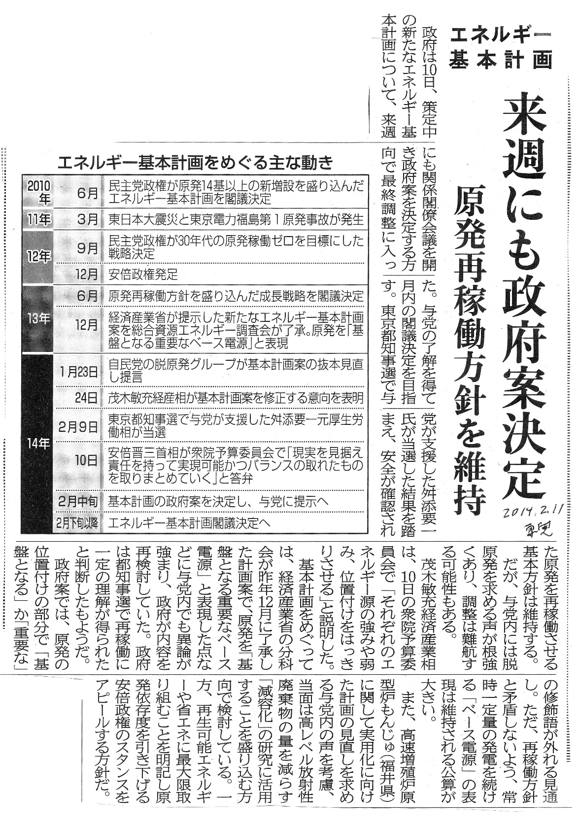 [2014_02_11_02]エネルギー基本計画 来週にも政府案決定 原発再稼働方針を維持(東奥日報2014年2月11日)