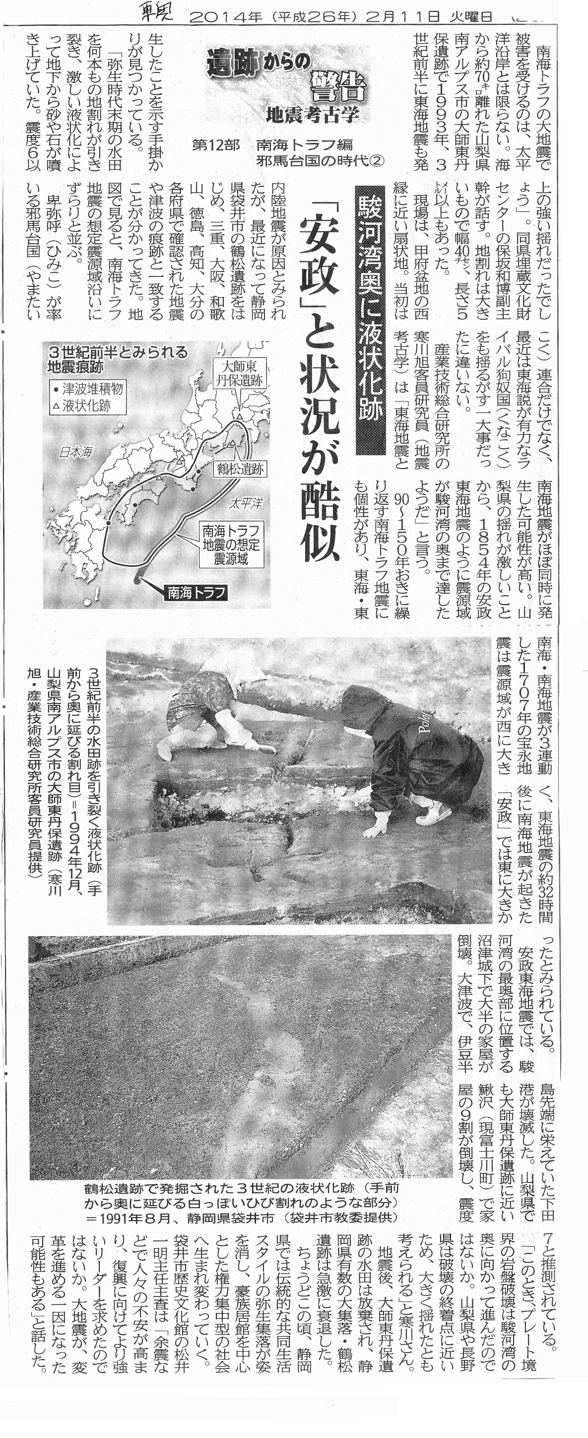 [2014_02_11_03]遺跡からの警告 地震考古学 南海トラフ編 邪馬台国の時代2 駿河湾奥に液状化跡 「安政」と状況が酷似(東奥日報2014年2月11日)