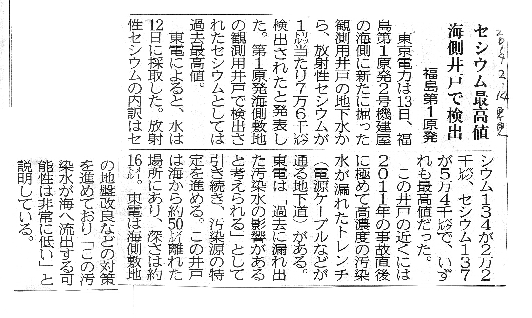 [2014_02_14_01]セシウム最高値 海側井戸で検出 福島第1原発(東奥日報2014年2月14日)