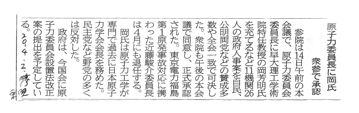 [2014_02_15_01]原子力委員長に岡氏 衆参で了承(東奥日報2014年2月15日)