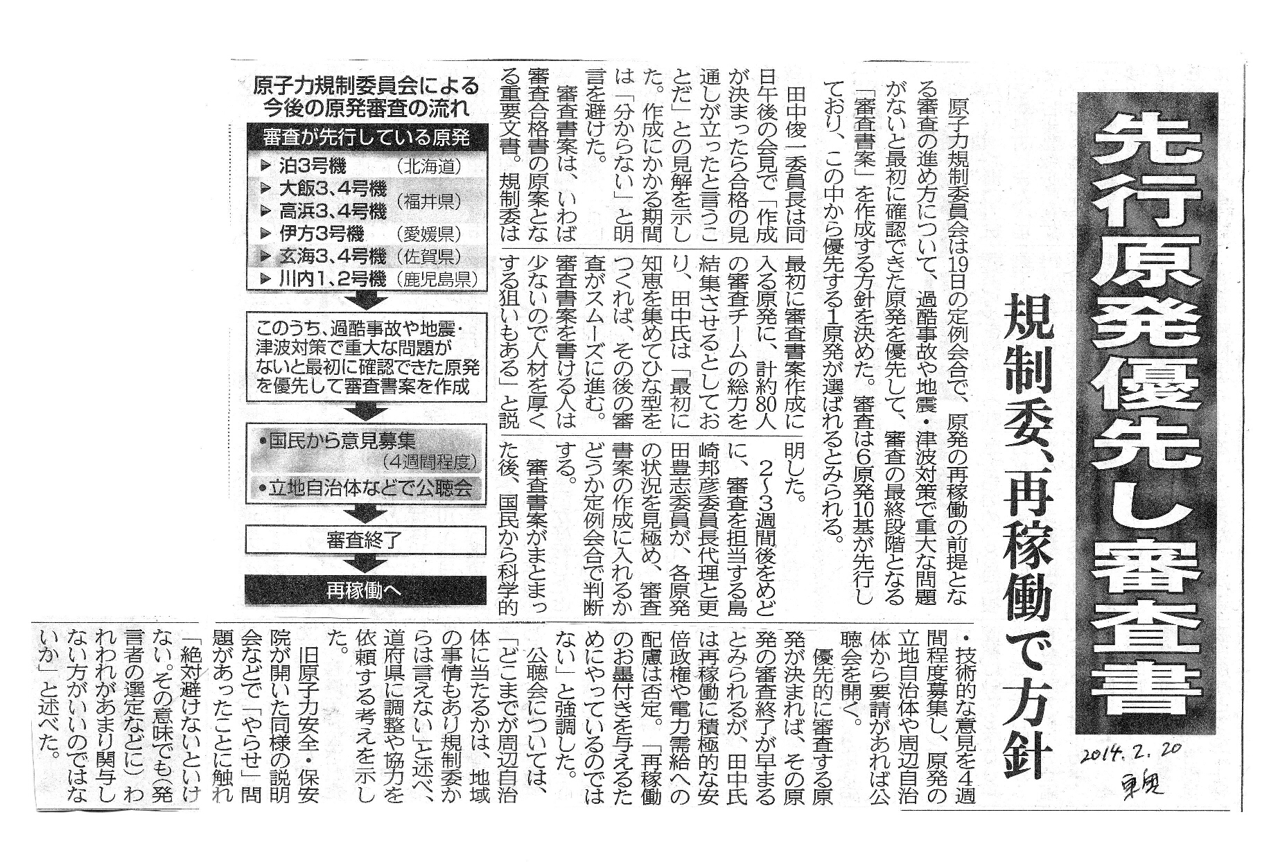 [2014_02_20_01]先行原発優先し審査書 規制委、再稼働で方針(東奥日報2014年2月20日)