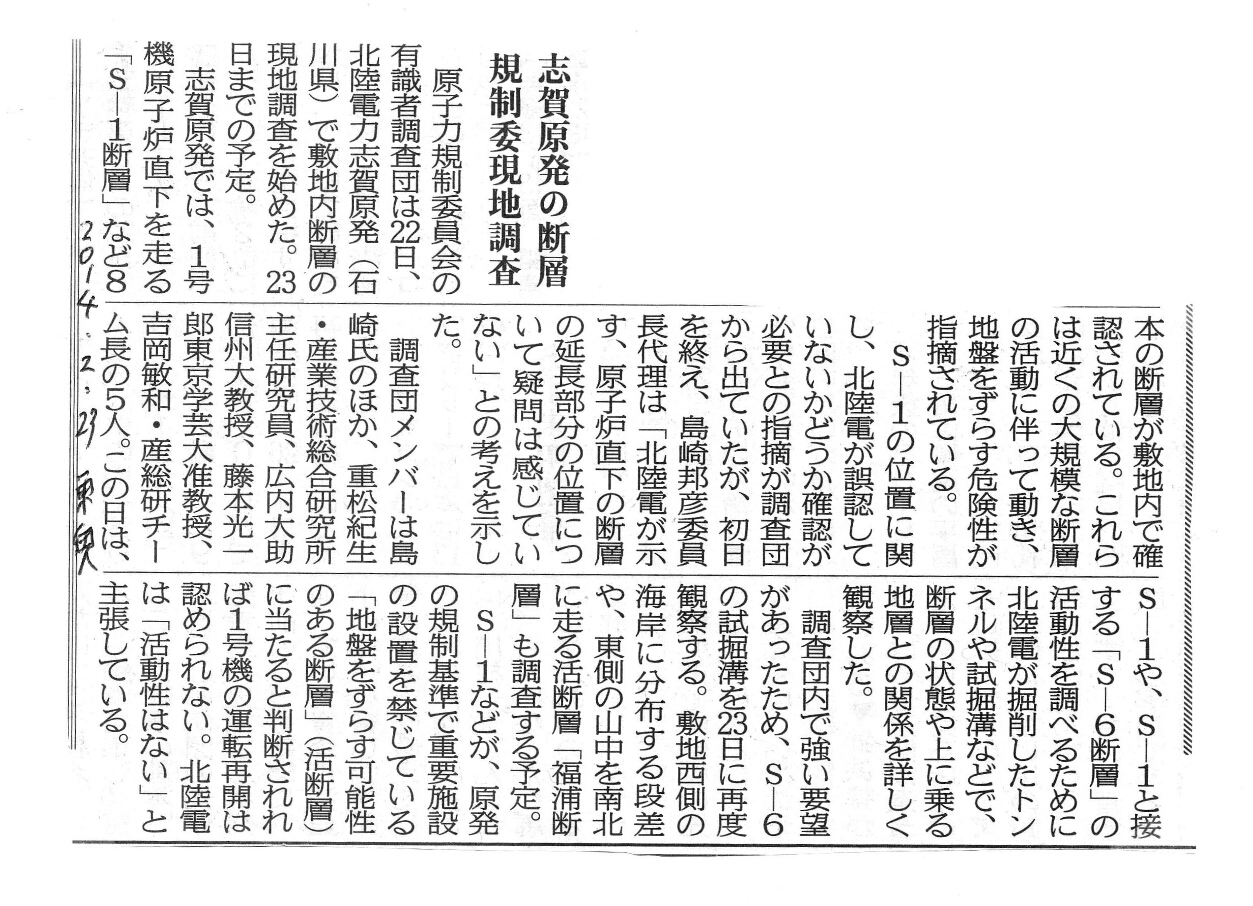 [2014_02_23_01]志賀原発の断層 規制委現地調査(東奥日報2014年2月23日)