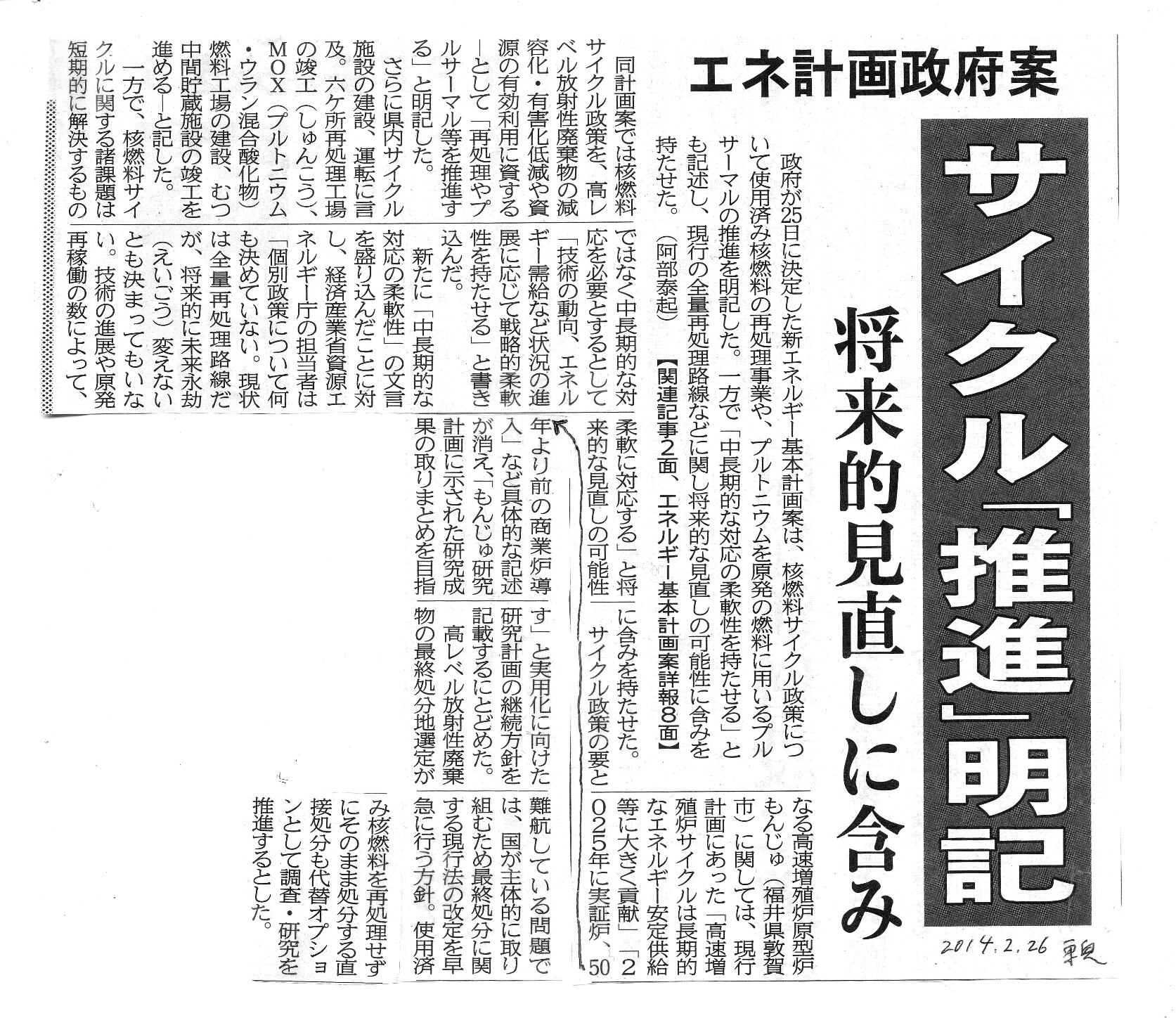 | [2014_02_26_01]エネ計画政府案 サイクル「推進」明記 将来見直しに含み(東奥日報2014年2月26日) |