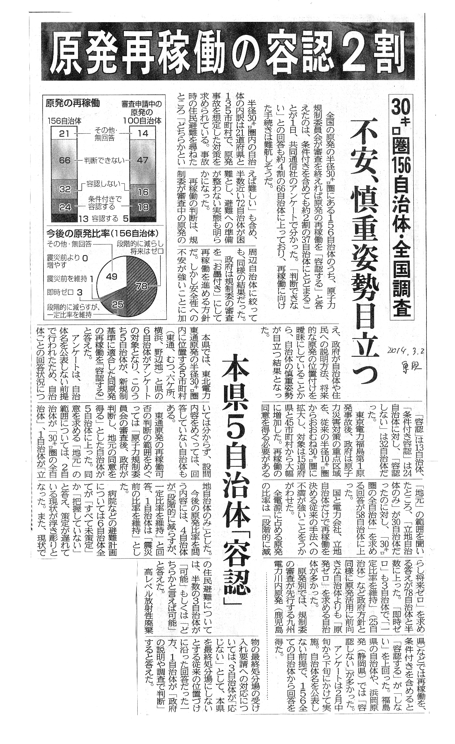 [2014_03_02_01]原発再稼働の容認2割 30キロ圏156自治体・全国調査 不安、慎重姿勢目立つ 本県5自治体「容認」(東奥日報2014年3月2日)