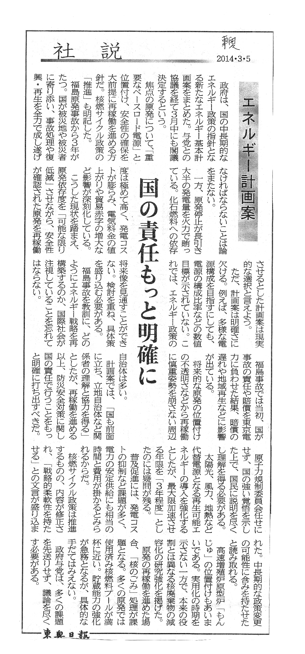 [2014_03_05_01]社説 エネルギー計画案 国の責任もっと明確に(東奥日報2014年3月5日)