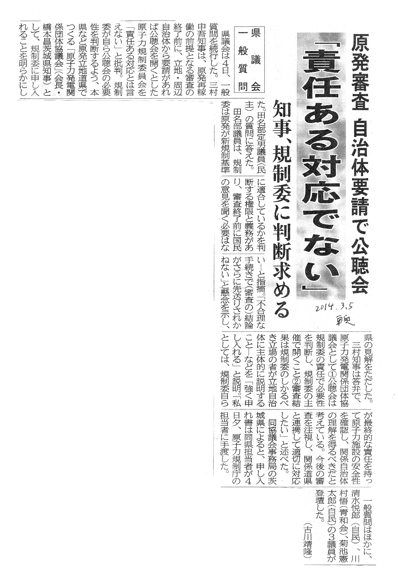 [2014_03_05_02]県議会一般質問 原発審査 自治体要請で公聴会 「責任ある対応ではない」 知事、規制委に判断求める(東奥日報2014年3月5日)