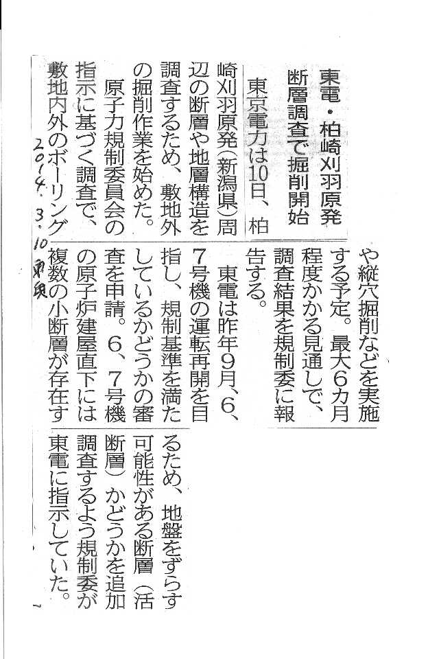 [2014_03_10_03]東電・柏崎刈羽原発 断層調査で掘削開始(東奥日報2014年3月10日)