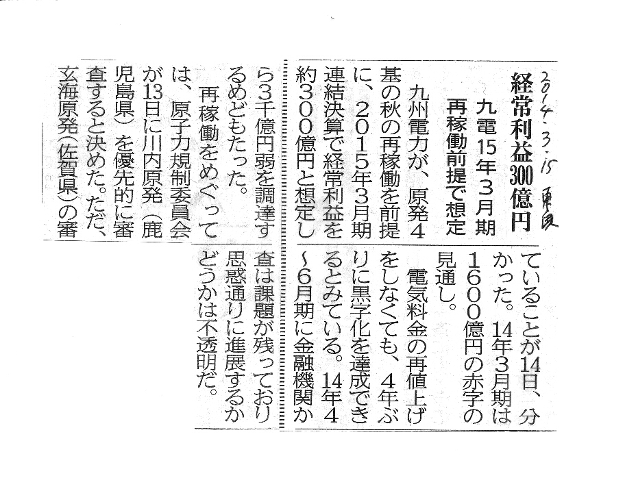 [2014_03_15_02]経常利益300億円 九電15年3月期 再稼働前提で想定(東奥日報2014年3月15日)