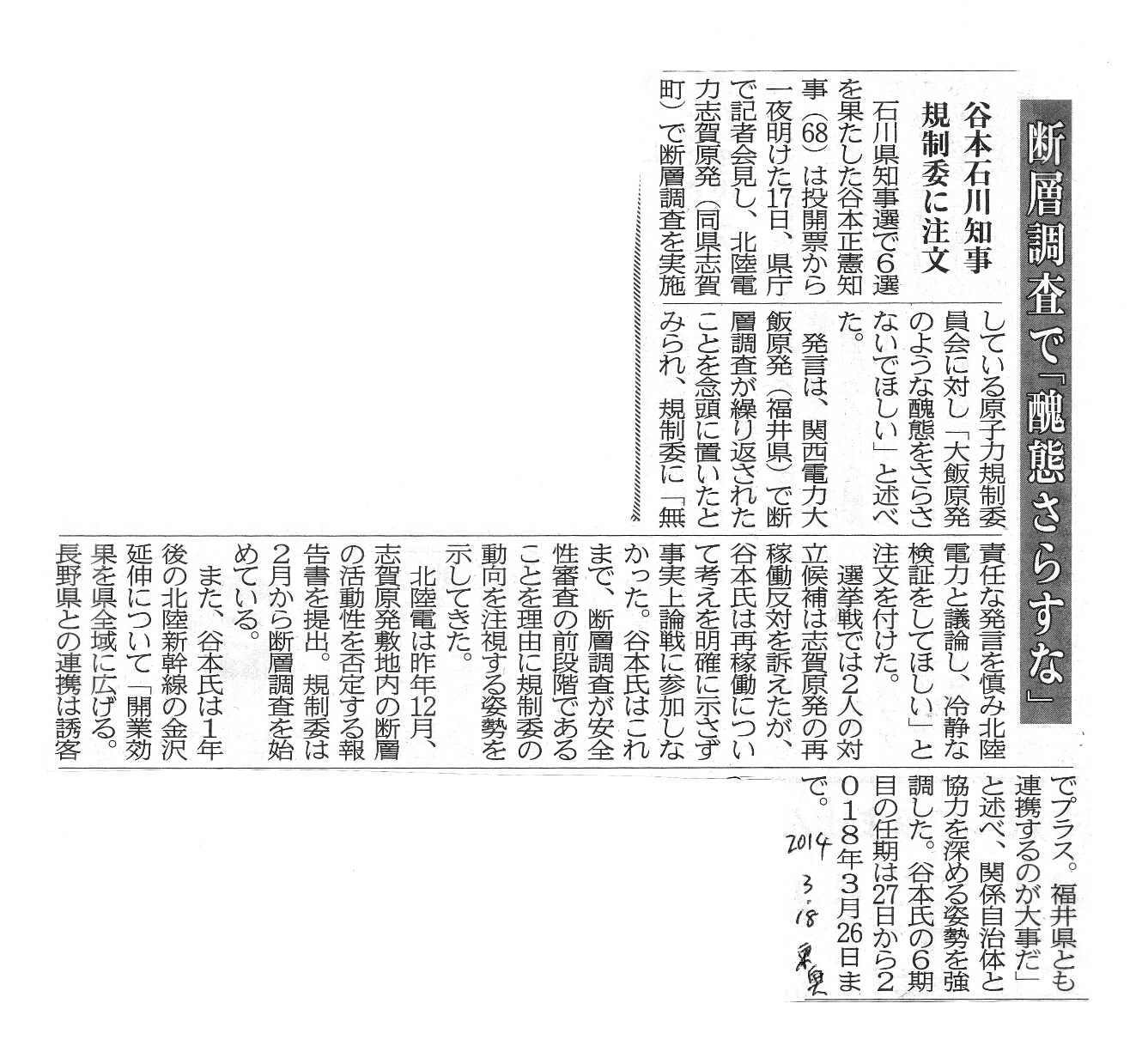 [2014_03_18_01]断層調査で 醜態さらすな 谷本石川知事 規制委に注文(東奥日報2014年3月18日)