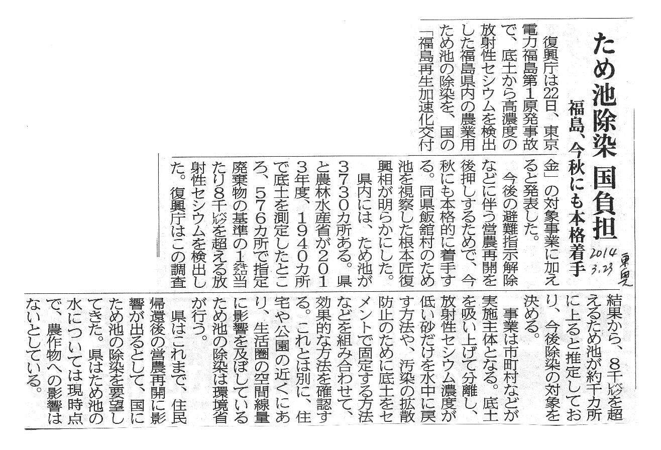 [2014_03_23_01]ため池除染 国負担 福島、今秋にも本格着手(東奥日報2014年3月23日)