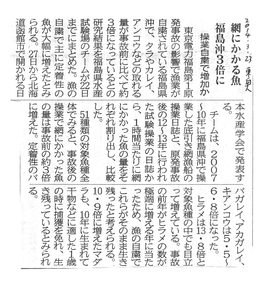 [2014_03_23_02]網にかかる魚 福島沖3倍に 操業自粛で増加か(東奥日報2014年3月23日)