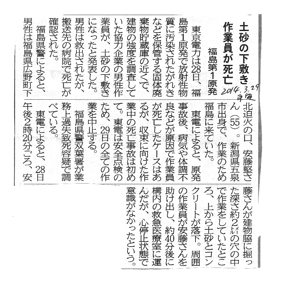 [2014_03_24_02]土砂の下敷き 作業員が死亡 福島第1原発(東奥日報2014年3月24日)