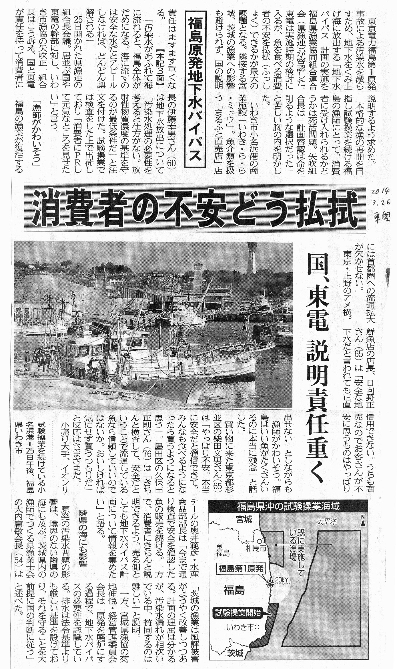| [2014_03_26_01]福島原発地下水バイパス 消費者の不安どう払拭 国、東電 説明責任重く(東奥日報2014年3月26日) |