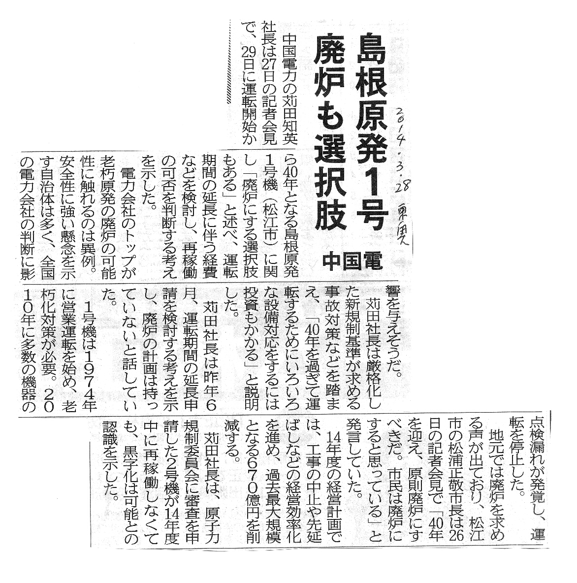 [2014_03_28_02]島根原発1号 廃炉も選択肢 中国電(東奥日報2014年3月28日)