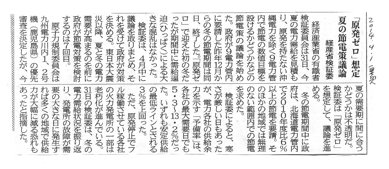 [2014_04_01_01]「原発ゼロ」想定 夏の節電策議論 経産省検証委(東奥日報2014年4月1日)
