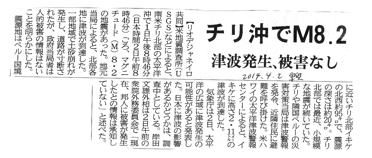 | [2014_04_02_02]チリ沖でM8.2 津波発生、被害なし(東奥日報2014年4月2日) |