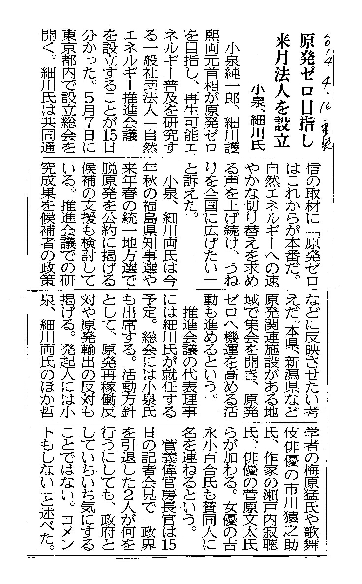 [2014_04_16_01]原発ゼロ目指し 来月法人を設立 小泉、細川氏(東奥日報2014年4月16日)