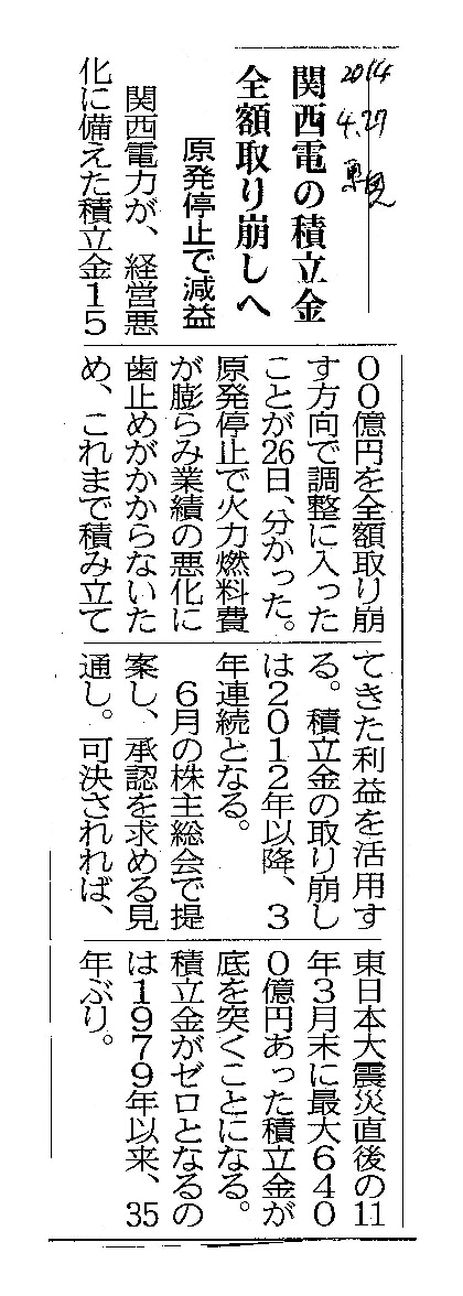 [2014_04_27_01]関西電の積立金 全額取り崩しへ 原発停止で減益(東奥日報2014年4月27日)