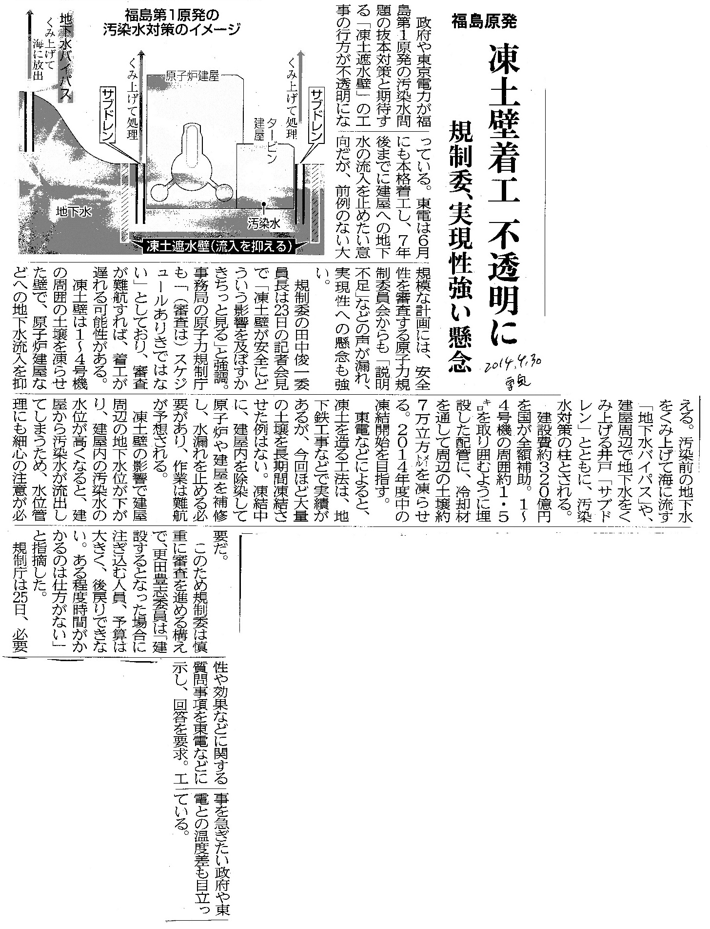 | [2014_04_30_03]福島原発 凍土壁着工不透明に 規制委、実現性強い懸念(東奥日報2014年4月30日) |