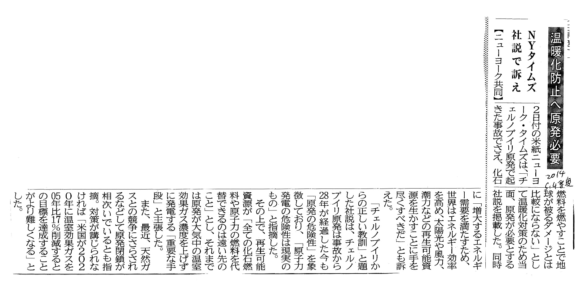 [2014_05_04_02]温暖化防止へ原発必要 NYタイムズ 社説で訴え(東奥日報2014年5月4日)