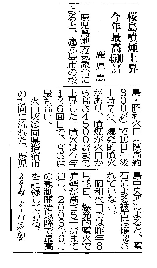 [2014_05_11_01]桜島噴煙上昇 今年最高4500メートル 鹿児島(東奥日報2014年5月11日)