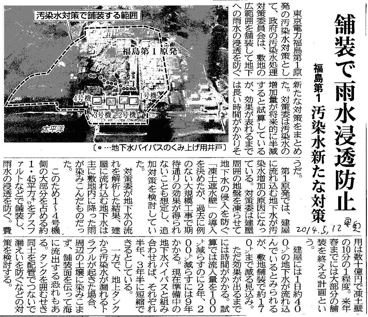 | [2014_05_12_01]舗装で雨水浸透防止 福島第1 汚染水新たな対策(東奥日報2014年5月12日) |