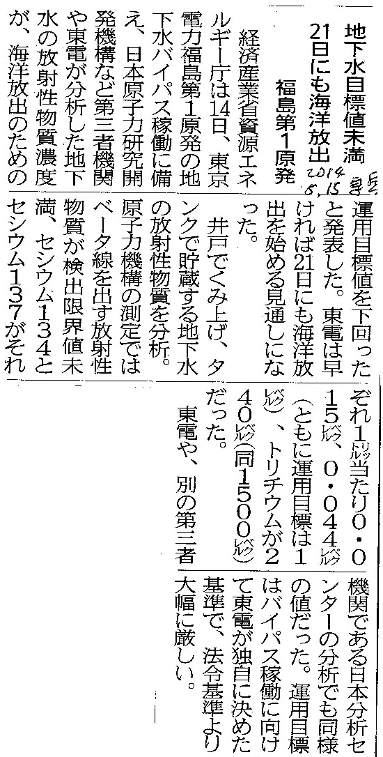 [2014_05_15_01]地下水目標値未満 21日にも海洋放出 福島第1原発(東奥日報2014年5月15日)