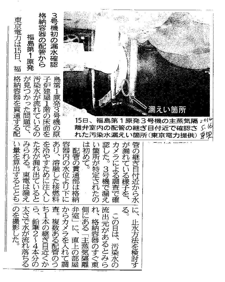[2014_05_16_01]3号機初の漏水確認 格納容器の配管から 福島第1原発(東奥日報2014年5月16日)