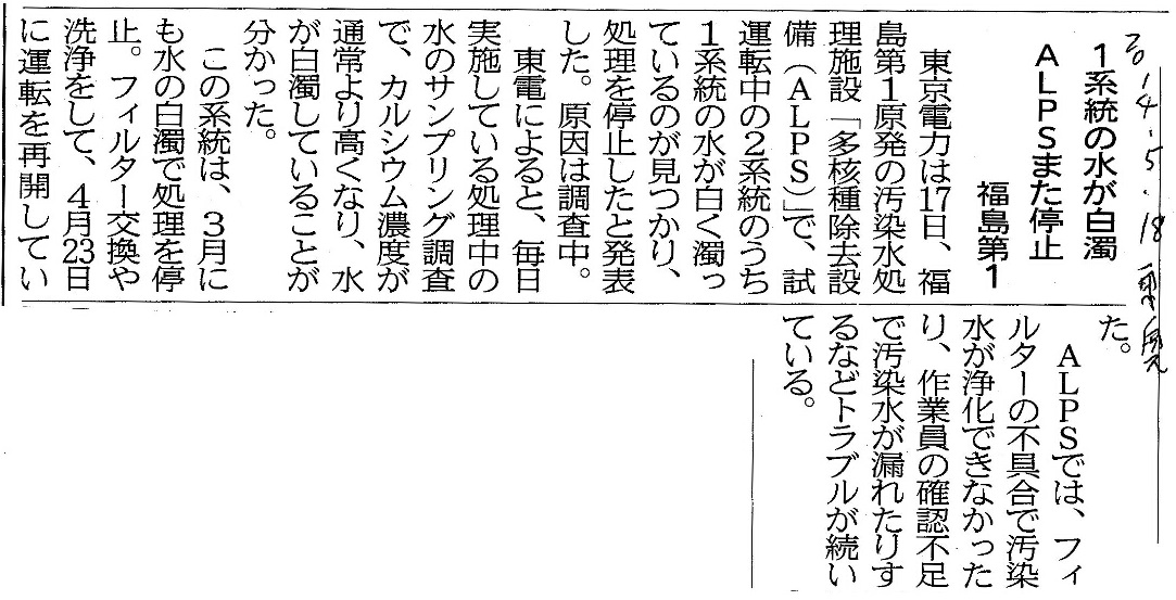 | [2014_05_18_01]1系統の水が白濁 ALPSまた停止 福島第1(東奥日報2014年5月18日) |