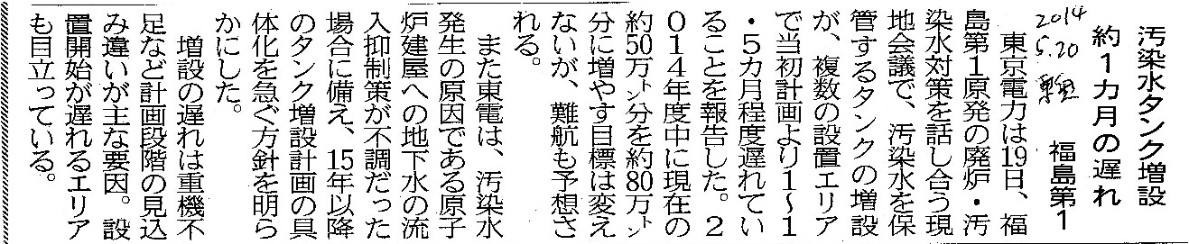 | [2014_05_20_01]汚染水タンク増設 約1カ月遅れ 福島第1(東奥日報2014年5月20日) |