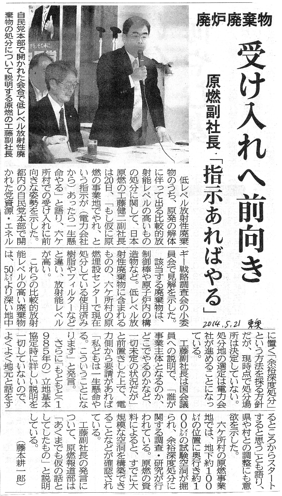 | [2014_05_21_04]廃炉廃棄物 受け入れへ前向き 原燃副社長 「指示あればやる」(東奥日報2014年5月21日) |