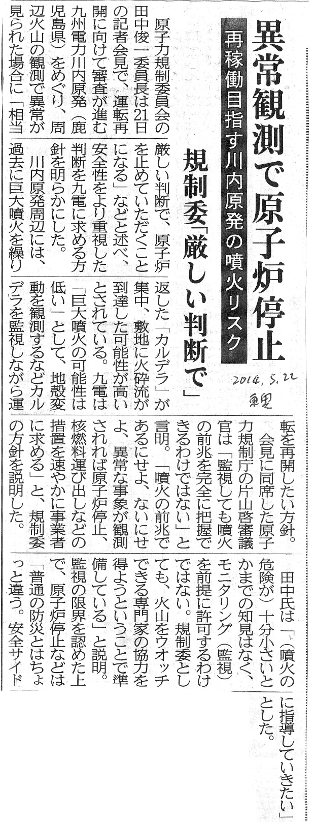 [2014_05_22_04]異常観測で原子炉停止 再稼働目指す川内原発の噴火リスク 規制委「厳しい判断で」(東奥日報2014年5月22日)