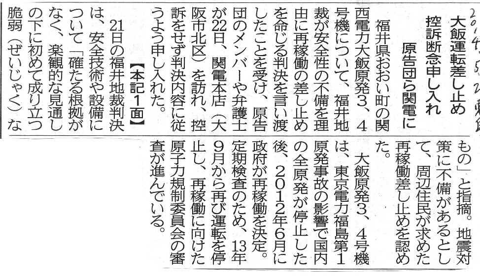 [2014_05_22_07]大飯原発差し止め 控訴断念申し入れ 原告団ら関電に(東奥日報2014年5月22日)