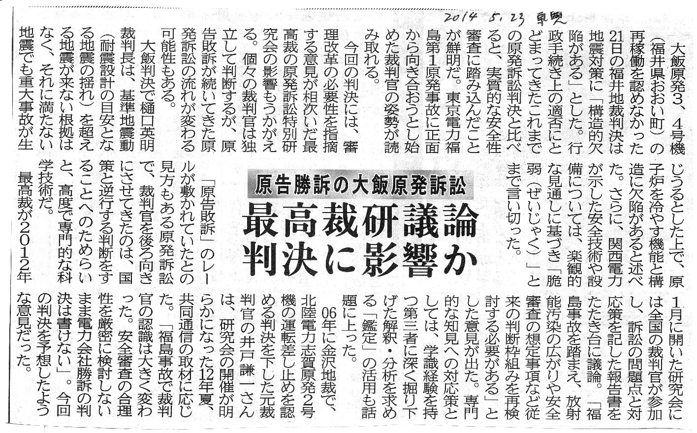 [2014_05_23_01]原告勝訴の大飯原発訴訟 最高裁研議論 判決に影響か(東奥日報2014年5月23日)