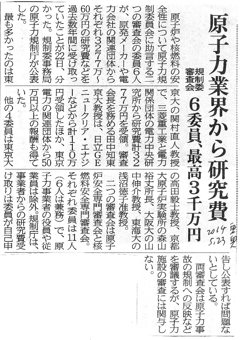 [2014_05_23_02]原子力業界から研究費 規制委審査会 6委員、最高3千万円(東奥日報2014年5月23日)