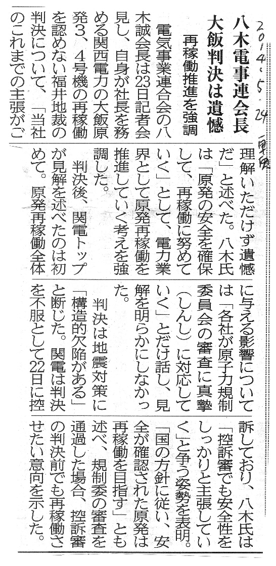 | [2014_05_24_01]八木電事連会長 大飯判決は遺憾 再稼働推進を強調(東奥日報2014年5月24日) |