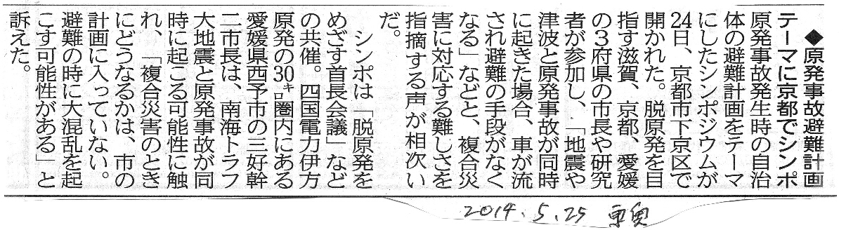 [2014_05_25_02]原発事故避難計画テーマに京都でシンポ(東奥日報2014年5月25日)