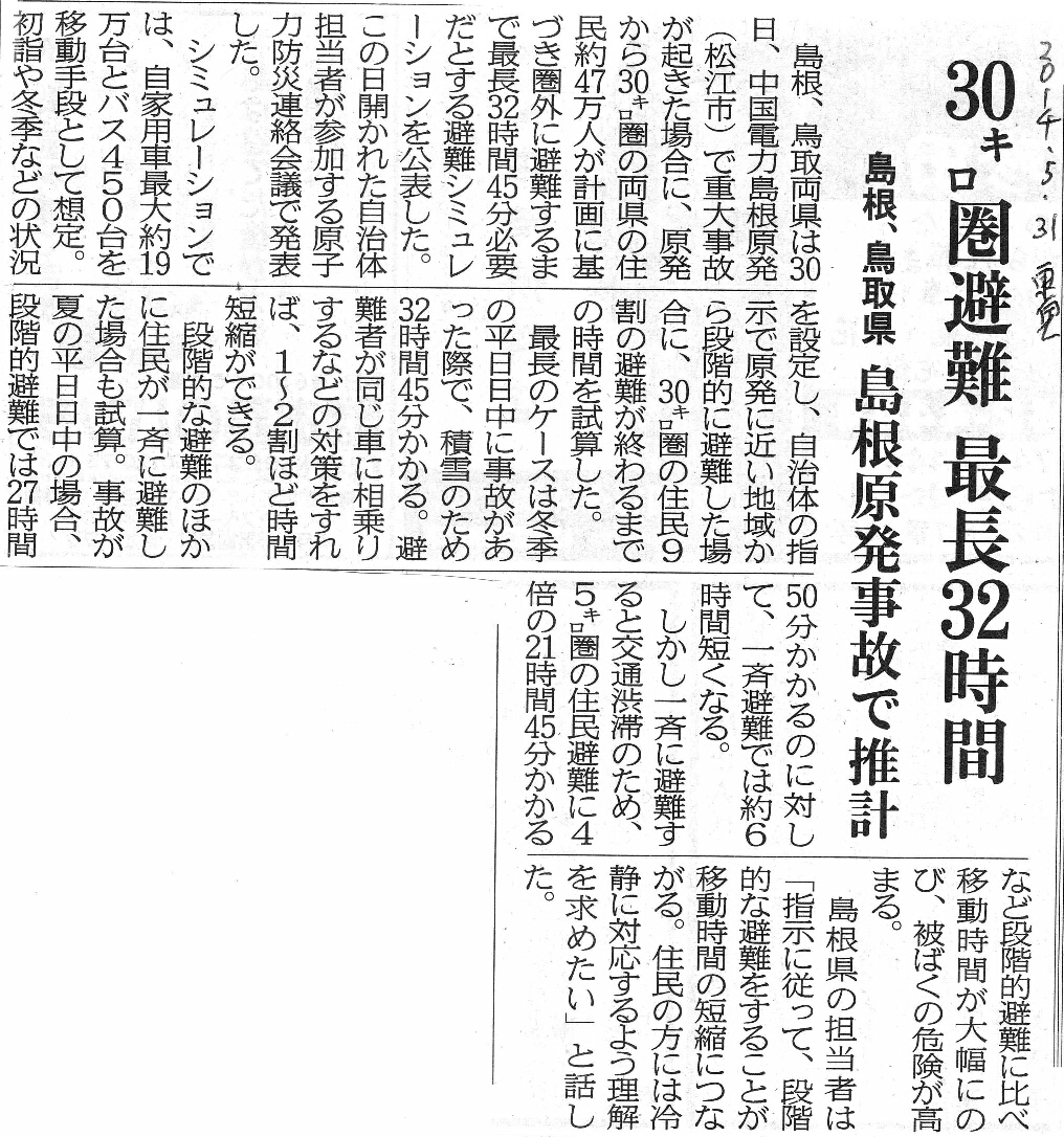 [2014_05_31_02]30キロ圏避難 最長32時間 島根、鳥取県 島根原発で推計(東奥日報2014年5月31日)